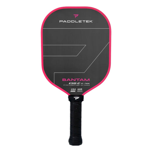 The Bantam ESQ-C was designed in collaboration with pickleball pro, Andrea Koop, to provide a combination of power, spin, and forgiveness. PT-700 unidirectional RAW carbon fiber is combined with our more powerful Bantam core to give serious players controllable power and spin capability. A 5.5" handle reduces wind drag and allows for a two-handed backhand, while a large, consistent sweet spot adds finesse to every shot.