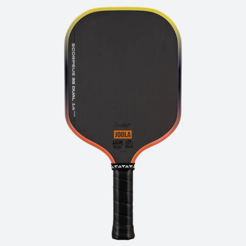 The wide-body design of the Scorpeus 3S Dual is a great paddle for a defensive-style player or a player who prefers quick responsiveness during high-intensity kitchen battles. A dual-colored orange and yellow gradient adorns the Scorpeus 3S Dual 14mm edge guard, evoking images of the setting sun. Dual in color and certification, this paddle is both UPA-A pro-certified and USAP PBCoR.43 Certified, so you can play long after the sun goes down.